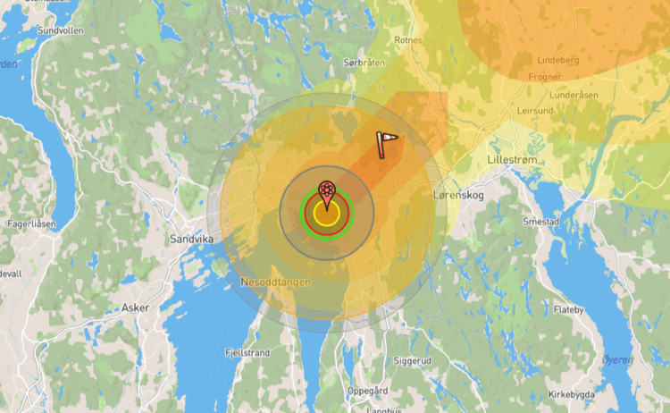 Illustrasjon: Oslo hvis truffet av en Topol SS-25, et taktisk atomvåpen fremdeles i besittelsen til de russiske styrkene. Vinden ville i denne simuleringen ikke være nådig mot Lillestrøm, Jessheim og omegn. Kilde: https://nuclearsecrecy.com/nukemap/