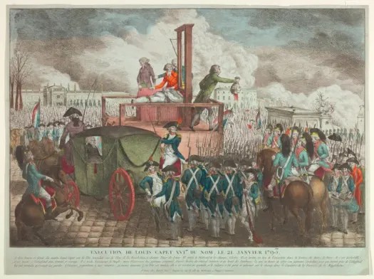 llustrasjonsbilde: «Henrettelsen av kong Ludvig XVI», (c. 1793) kolorert trykk publisert av Paul-André Basset etter et bilde av Georg Heinrich Sieveking.