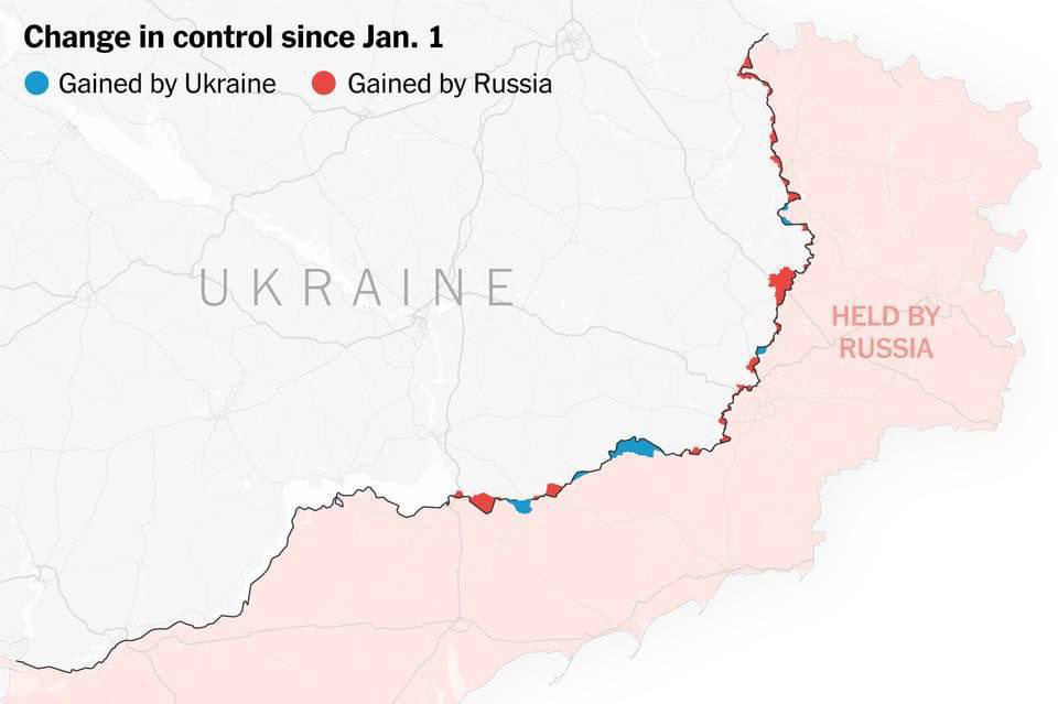 Illustrasjon: Territorielle endringer i Ukraina mellom 01.01.2023 og 01.11.2023 (New York Times).