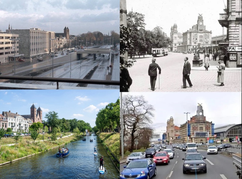 Illustrasjon: Utrecht (til venstre) har fjernet motorveien fra 1970-tallet for å restaurere den gamle kanalen Catharijnesingel. Praha (til høyre) har foreløpig ikke reversert utviklingen rundt hovedstasjonen.