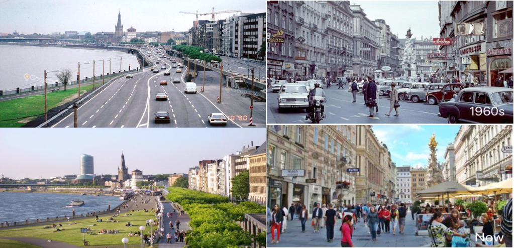 Illustrasjon: Düsseldorf (til venstre) har ved havnepromenaden gjemt biltrafikken i en tunnel, mens Wien (til høyre) har sperret den berømte gaten Graben for biler.