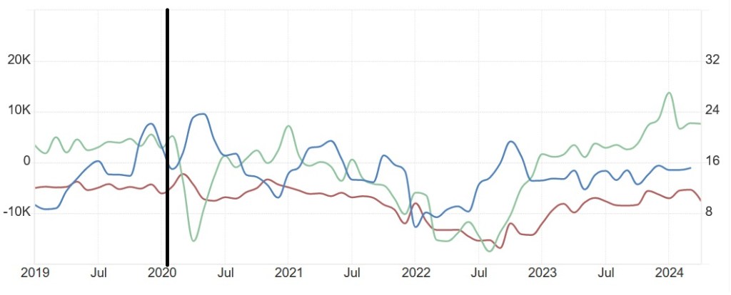 Nok en gang ser vi mest positiv utvikling for det grønne landet. Det blå landet virker å ha gjort det dårligst her.