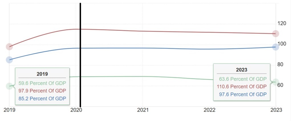 Over perioden har gjeldsgraden av BNP økt mest for det røde landet, minst for det grønne.