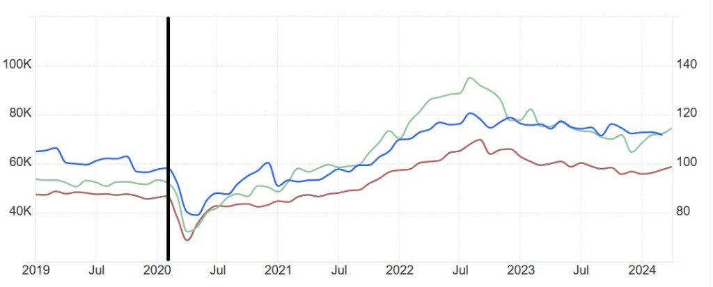 Ved hjelp av nettstedet tradingeconomics.com kan vi med enkelthet sammenligne den britiske økonomien direkte med den tyske og den franske langs et stort antall indikatorer. For å få med oss trendene pre-Brexit, setter vi startdatoen for den komparative analysen nøyaktig ett år før Storbritannia forlot Den europeiske union 31. januar 2020. Brexit er markert med en sort strek.