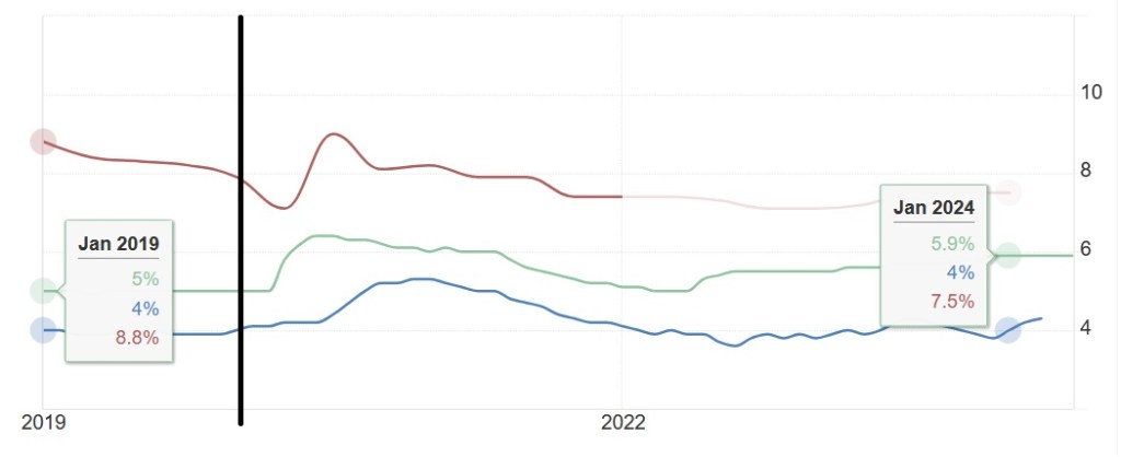 De fleste land opererer med et inflasjonsmål på to prosent. Å ligge himmelhøyt over dette er å anse som negativt. Derav kan vi slutte at det i intervallet har gått best med det røde landet, verst med det blå.