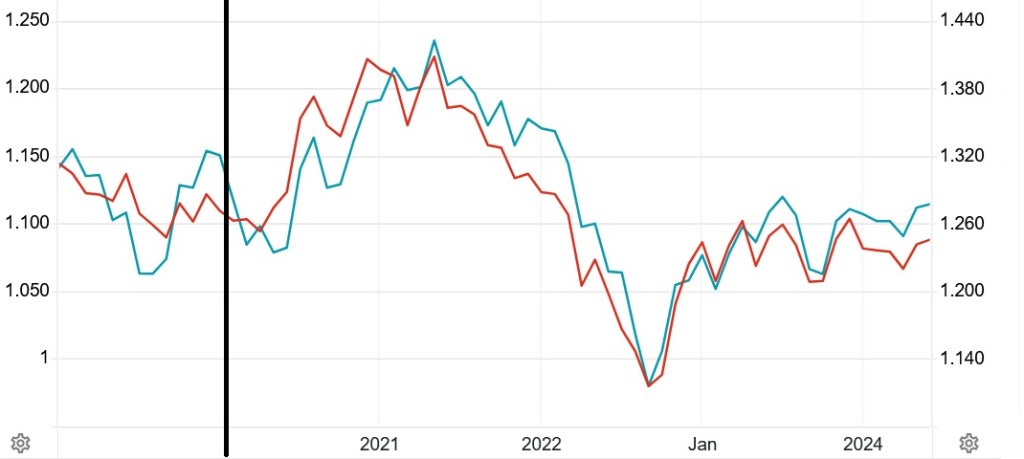 Vi kan nå studere valutakursene mot dollar. Britisk pund er markert i blått, euroen i rødt, mens datoen for Brexit igjen er vist med en sort linje: