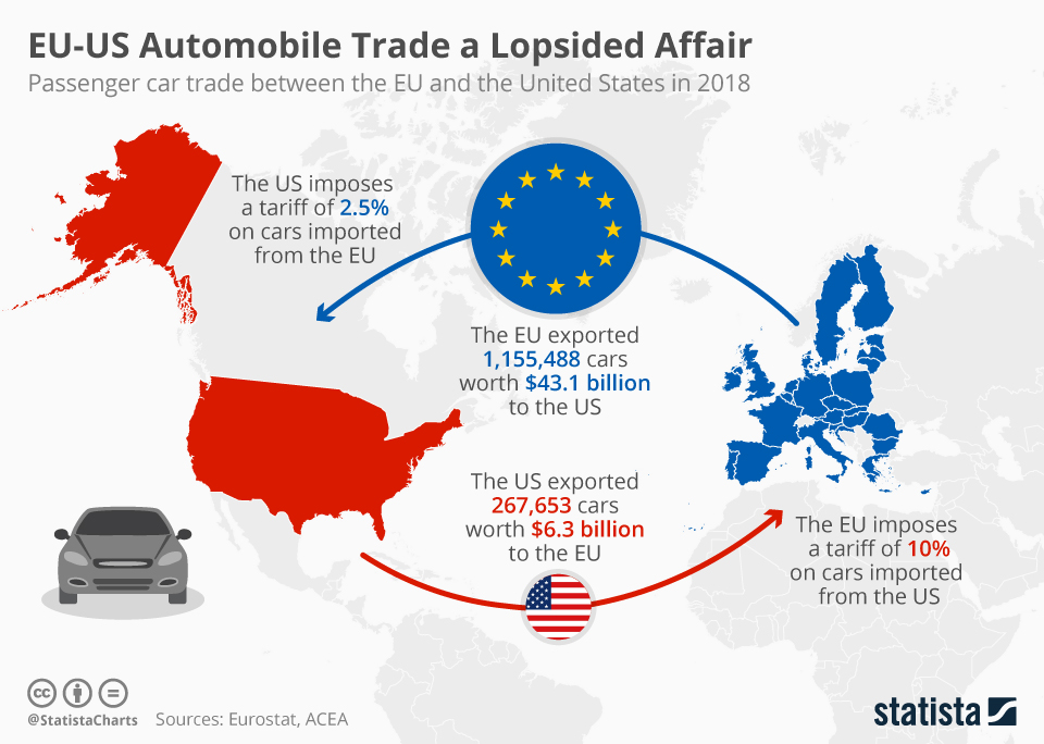 Ta i betraktning de amerikanske bilselskapene: Den amerikanske tollen på biler fra EU har ligget på 2,5 %, mens den europeiske tollen på amerikanske biler har vært 10 %. Det betyr at amerikanske biler har stått overfor urettferdig konkurranse fra Europa. Det finnes således et rasjonelt holdepunkt for amerikanske mottiltak, i et forsøk på å presse frem mer rettferdig handel.