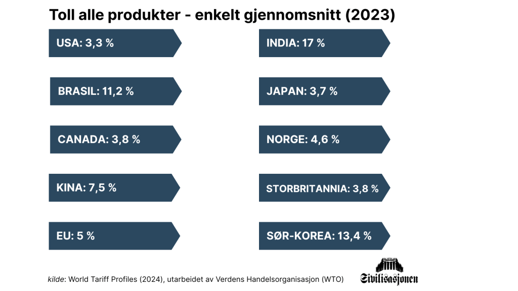 Man har hos de europeiske og kinesiske kritikerne av USAs proteksjonisme sett en viss inkonherens: Om toll virkelig er noe alle taper på, hvorfor river de i så fall ikke ned sine egne tollmurer? Norge hadde i 2023 et høyere tollnivå enn USA, noe det har rådet politisk konsensus om. Beijing har lagt seg på en anselig mer proteksjonistisk linje, uten at mange av den grunn har anklaget Kina for økonomisk vanstyre de siste tiårene. Det er fordi de har gjennomgått en astronomisk vekst.