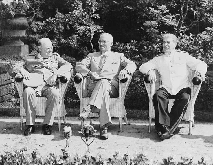 Storbritannias statsminister Winston Churchill, USAs president Harry S. Truman og Sovjetunionens generalsekretær Josef Stalin ved Potsdamkonferansen i Tyskland, 25. juli 1945.